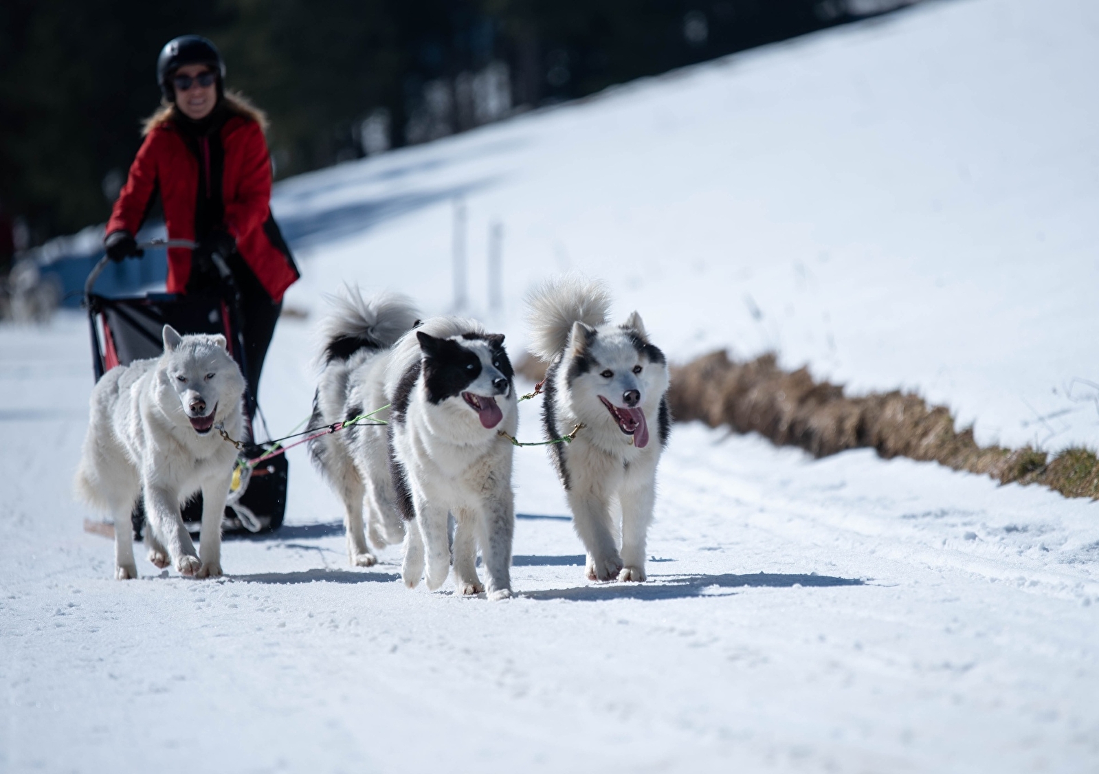 Nehmen Sie sitzend an Bord eines Schlittens Platz und genießen Sie die Landschaft durch Schluchten und Wälder.