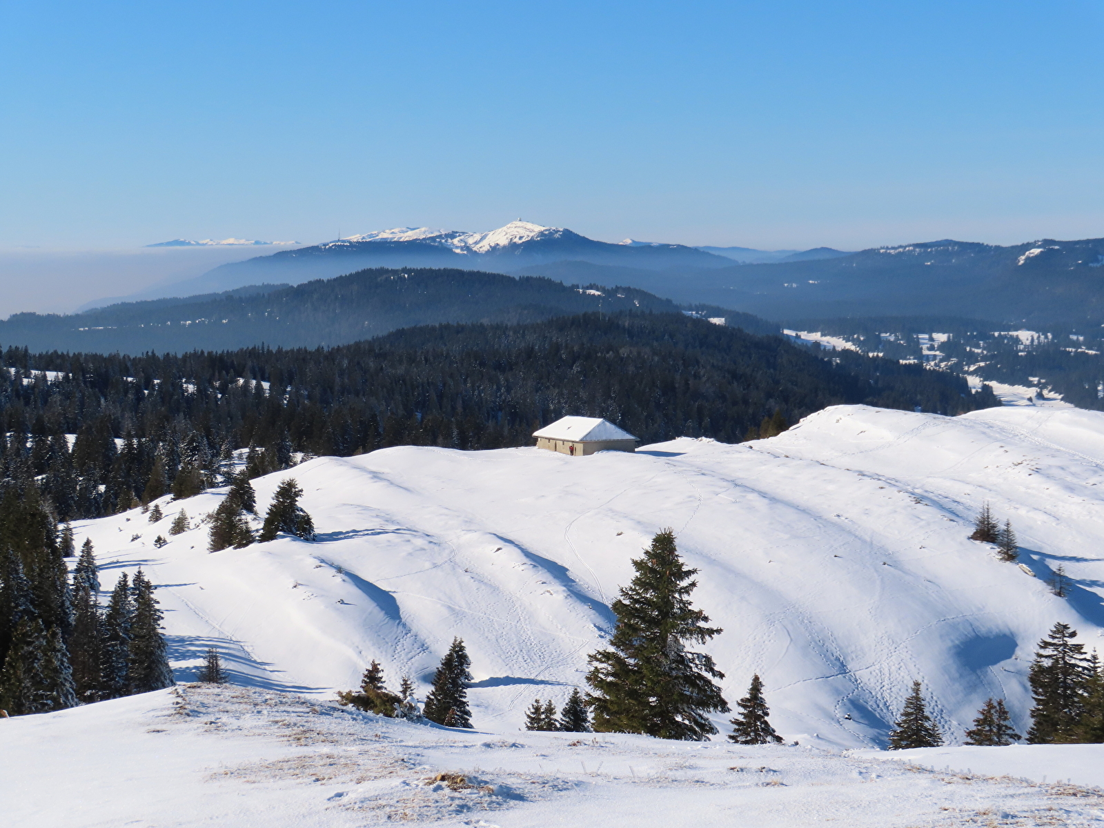 An diesem letzten Tag werden wir Kurs auf die Combe des Bégnines auf fast 1500m Höhe nehmen. Es handelt sich um eine thronende Synklinale, die im Sommer ein großes Weidegebiet ist und im Winter wie im hohen Norden aussieht. Der Weg ist angenehm bis zur Aussicht von Genf und dem Chalet à Roch, einem Gebiet mit Almhütten.