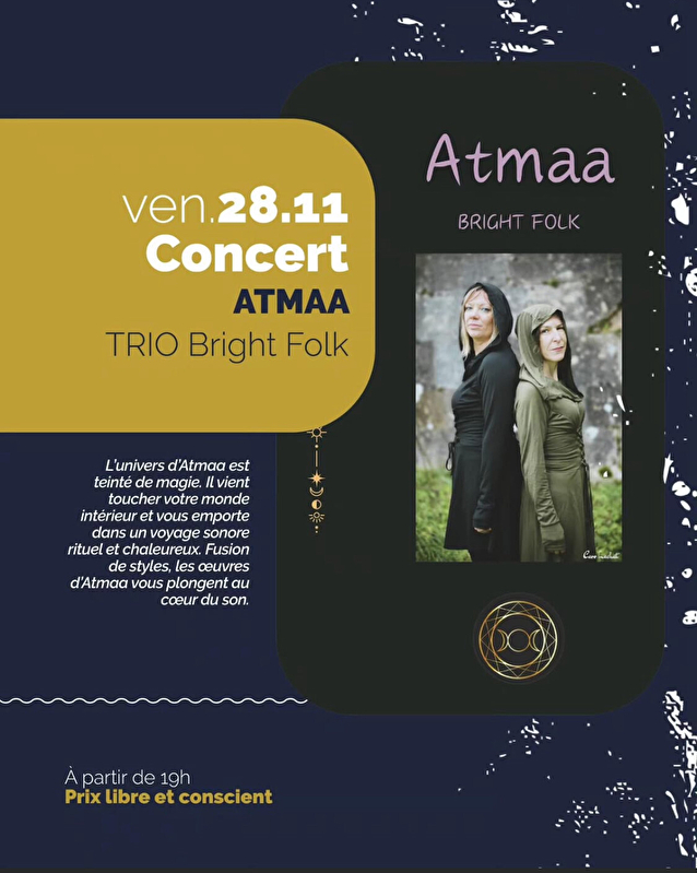 Atmaa ist ein Bright Folk Trio mit neoschamanischen Einflüssen und World Spiritual. Seine Welt ist von Magie geprägt. Es berührt Ihre innere Welt und nimmt Sie mit auf eine rituelle und klangliche Reise.