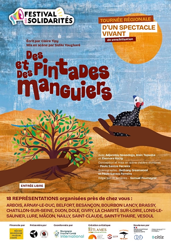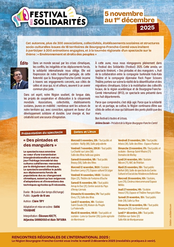 In einer Welt, die von Klimakrisen, Konflikten, Ungleichheiten und Vertreibungen erschüttert wird, verpflichtet uns die internationale Solidarität. Sie ist Ausdruck unserer gemeinsamen Menschlichkeit, dieser Brüderlichkeit, die die Region Bourgogne-Franche-Comté durch ihr konkretes Engagement an der Seite derjenigen verkörpert, die sich hier und anderswo für eine gerechtere gemeinsame Zukunft einsetzen. In diesem Sinne unterstützt unsere Region seit langem Projekte der Zusammenarbeit und der Erziehung zur Weltbürgerschaft. Vereine, Gebietskörperschaften, Schulen, Jugendliche in Mobilität: Es gibt zahlreiche Akteure in unserer Region, die sich mit Überzeugung für eine solidarische und nachhaltige Entwicklung einsetzen. Ihre Energie und ihre Kreativität sind eine Quelle der Inspiration. Vor diesem Hintergrund engagieren wir uns wieder voll und ganz für das Festival der Solidarität (Festisol) 2025. In diesem Jahr wird das Wandertheaterstück "Des Perlhühners und der Mangobäume", das aus der Zusammenarbeit zwischen der burkinischen Theatergruppe Kala-Kala Théâtre und der Theatergruppe Rock Paper Scissors Théâtre aus Dijon hervorgegangen ist, die Realität der Wüstenbildung und der klimabedingten Migration auf die Bühne bringen. Dank der Mobilisierung der lokalen Kollektive, der akademischen Region und von Bourgogne-Franche-Comté International (BFCI) wird diese Aufführung in unseren acht Departements gezeigt.