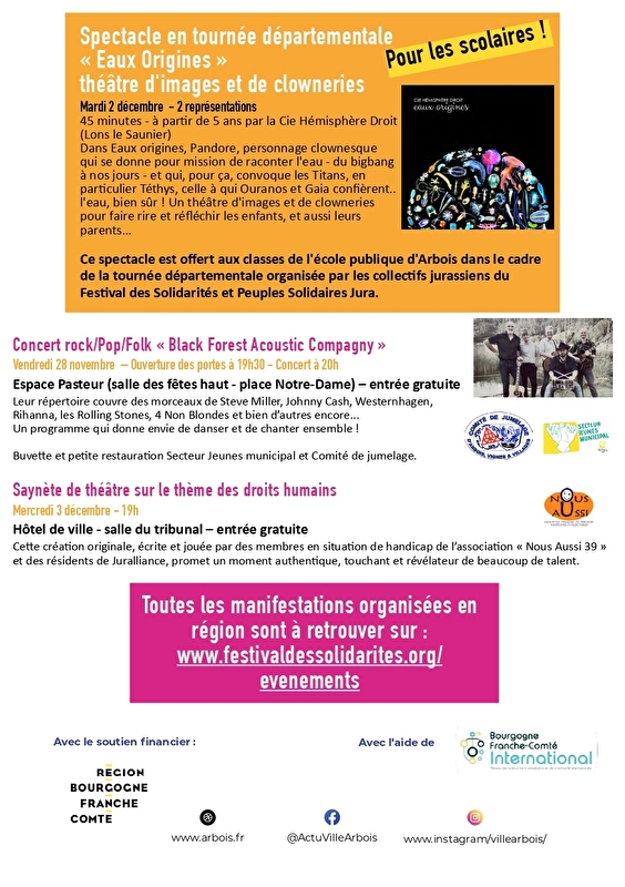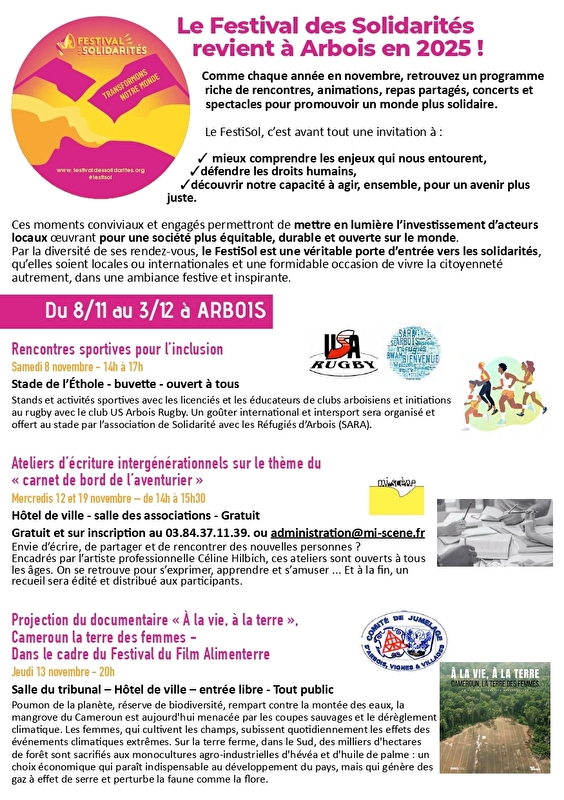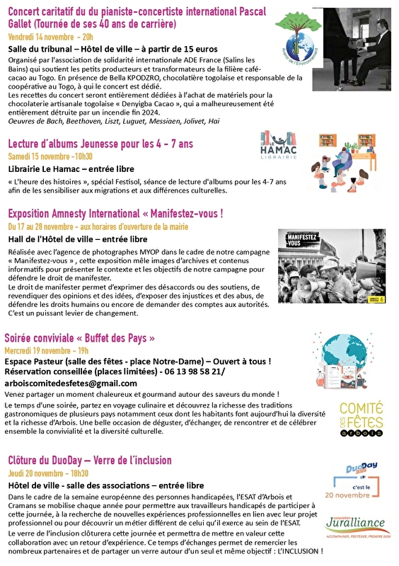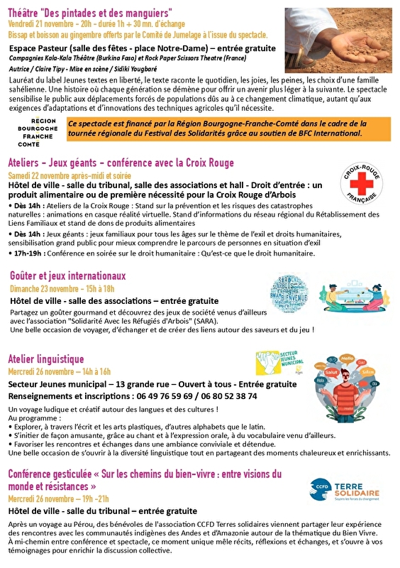 Wie jedes Jahr im November finden Sie ein reichhaltiges Programm mit Begegnungen, Animationen, gemeinsamen Mahlzeiten, Konzerten und Aufführungen, um eine solidarischere Welt zu fördern.