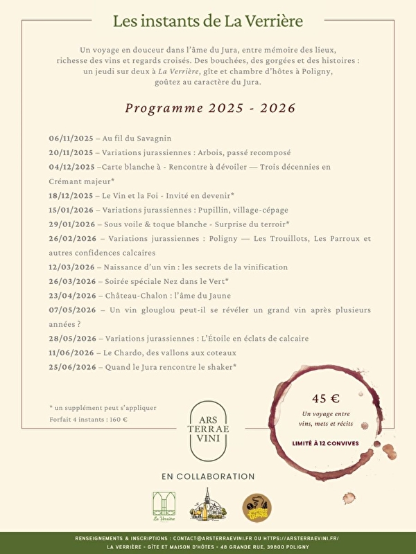 Wir freuen uns, Ihnen in einer neuen Ausgabe der Instants de La Verrière eine Sinnesreise ins Herz der Seele des Jura anbieten zu können. Zwischen dem Gedächtnis der Orte und dem Reichtum des Terroirs schlagen wir Ihnen eine zeitlose Klammer vor, um den einzigartigen Charakter unserer Region zu genießen.