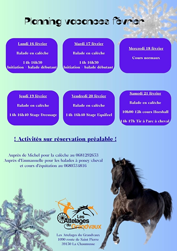Material: Wanderschuhe werden empfohlen, da sie einen Absatz haben, um sich an die Steigbügel anzupassen (Turnschuhe sind nicht empfehlenswert). Typische Kleidung: Jogginganzug oder weiche Hose, die nicht schmutzig werden darf (Staub, Schlamm, Tierhaare...) und dem Wetter angepasst ist (Regen, Kälte...).