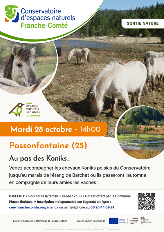 Das Conservatoire d'Espaces Naturels de Franche-Comté lädt Sie zu einem originellen Herbstausflug an der Seite seiner Konik-Polskipferde ein. Die Teilnehmer begleiten die Tiere bis zum Sumpfgebiet des Étang de Barchet, das vom Département Doubs zum Espace naturel sensible erklärt wurde. Dort treffen sie auf die Galloway-Kühe, die bereits vor Ort sind.