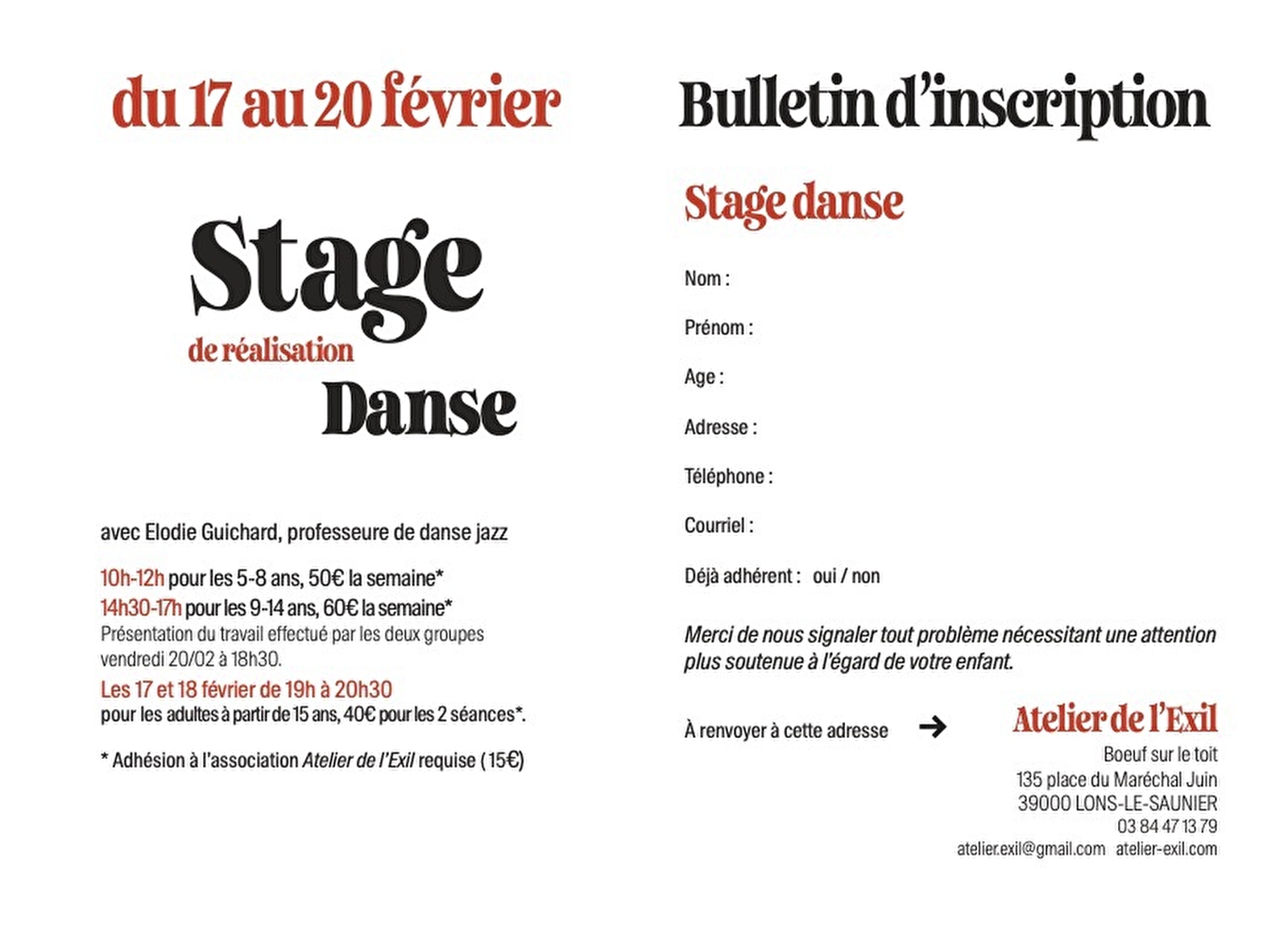 - Normalpreis (+ Mitgliedschaft im Atelier de l'Exil von 15€.) : 95€