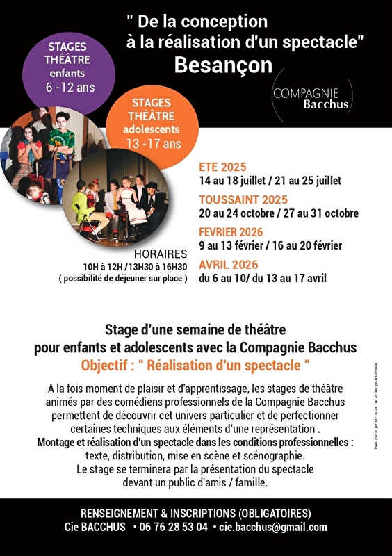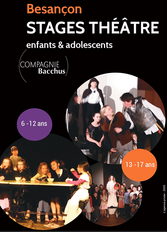 Die von professionellen Schauspielern der Compagnie Bacchus geleiteten Theaterpraktika sind sowohl ein Moment des Vergnügens als auch des Lernens. Sie ermöglichen es, diese besondere Welt zu entdecken und bestimmte Techniken zu perfektionieren, um die Elemente einer Aufführung zu erlernen. Aufführung am Ende des Kurses vor einem Publikum unter professionellen Bedingungen, Text, Besetzung, Regie und Bühnenbild.