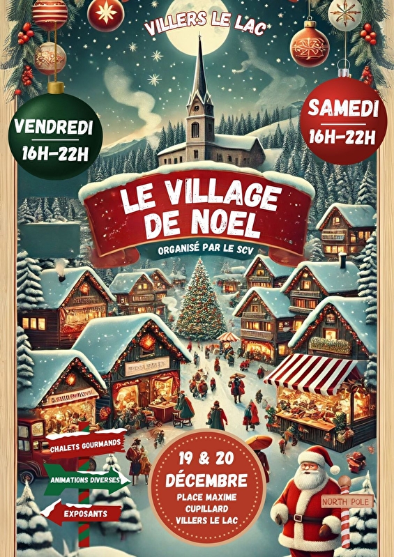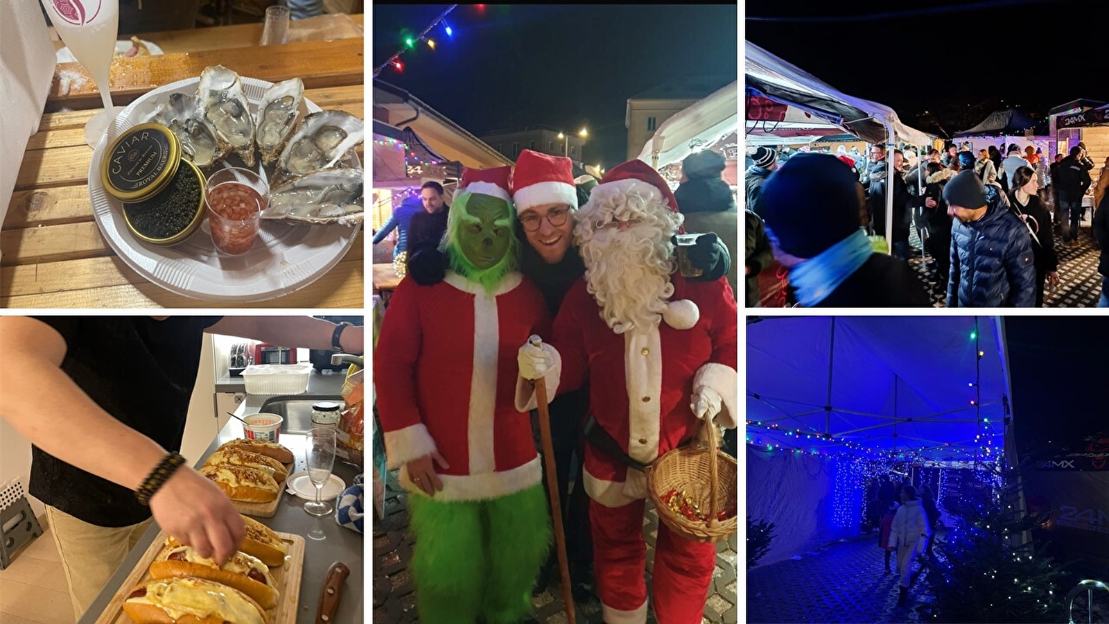 Weihnachtsdorf mit 11 Chalets mit Ausstellern und kulinarischen Ständen: Crêpes, Austern, Kaviar, Gänseleberpastete, Raclette-Brötchen, Schnecken, Erbsensuppe. Alle Arten von Getränken: heiße Schokolade, Glühwein, Tee, Rum, Champagner, Wein und Bier.