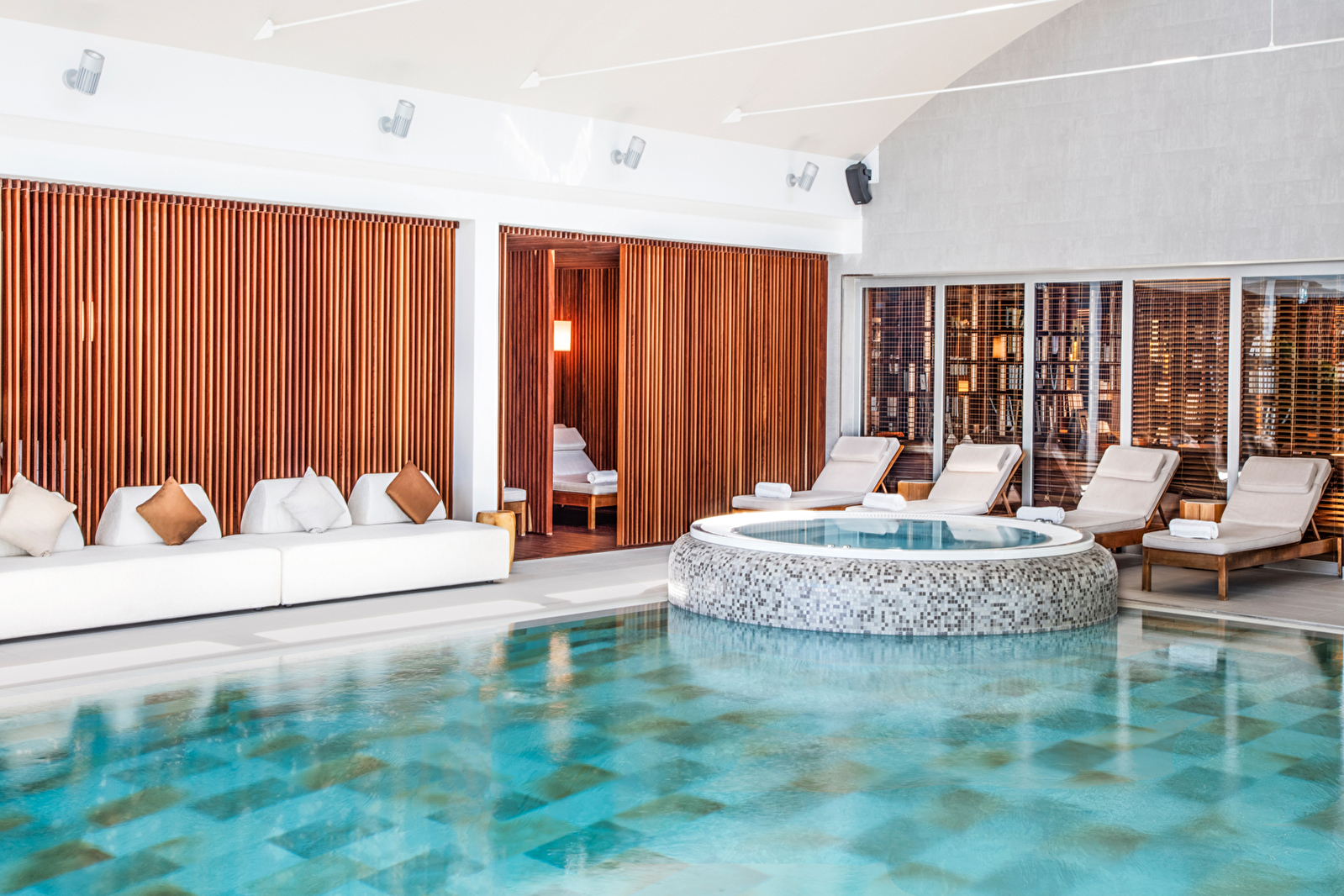 Sie haben Zugang zu einem Innenpool, einem Außenpool, einem Jacuzzi, einem Nordic Spa und einem Hammam. Körper- und Gesichtsbehandlungen
