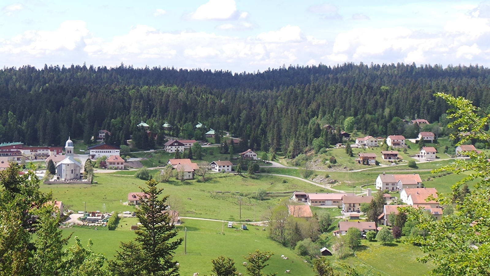 Von den Aussichtspunkten aus eröffnen sich weite Ausblicke auf den Talkessel und seine gewundenen Wasserläufe, während im Osten die Gipfel der Haute-Chaîne du Jura den Horizont betonen.