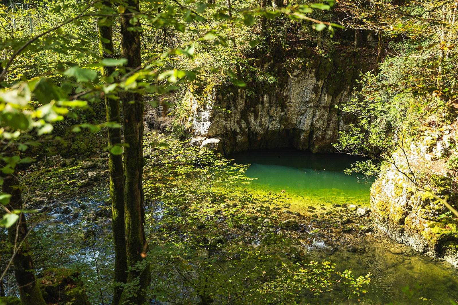 Erleben Sie eine unvergessliche Wanderung im Herzen des Jura: Erkunden Sie die rätselhafte Quelle Trou Bleu, lassen Sie sich vom beeindruckenden Saillard-Viadukt der Hirondelles-Linie überraschen und überqueren Sie den Fluss mithilfe der Himalaya-Stege auf einer Wanderung voller Entdeckungen und Eindrücke.