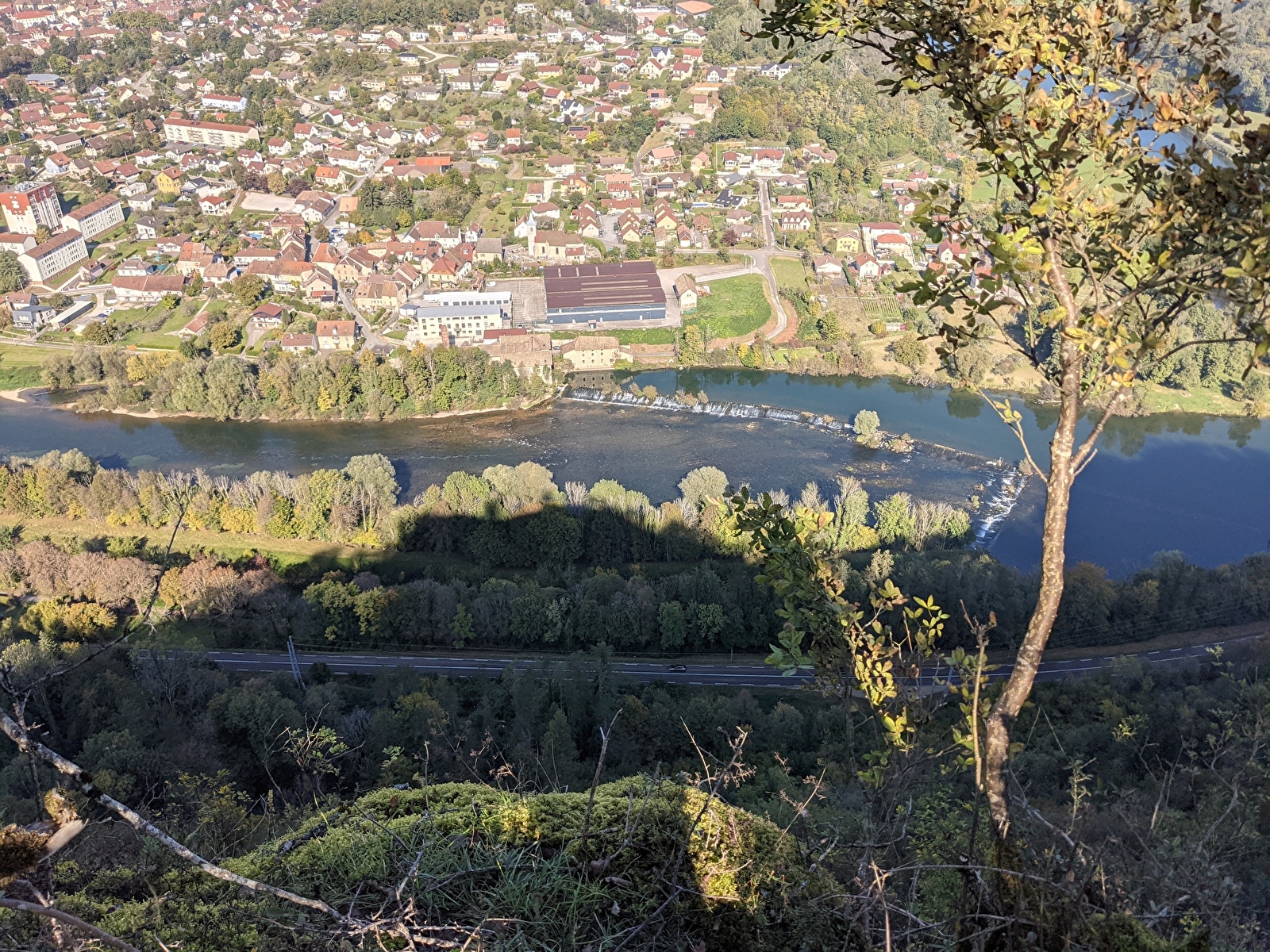 Strecke am Wasser entlang und über die Bergkämme mit dem Aussichtspunkt Croix de Châtard. Von hier aus sieht man die alte Pfeifenfabrik Ropp, das alte Dorf Cour, Baume und seine Hügel... Der Doubs, der unterhalb zwischen der Fente de Babre und den Felsen von Sous-Buen fließt, bildet das Becken von Gondé.