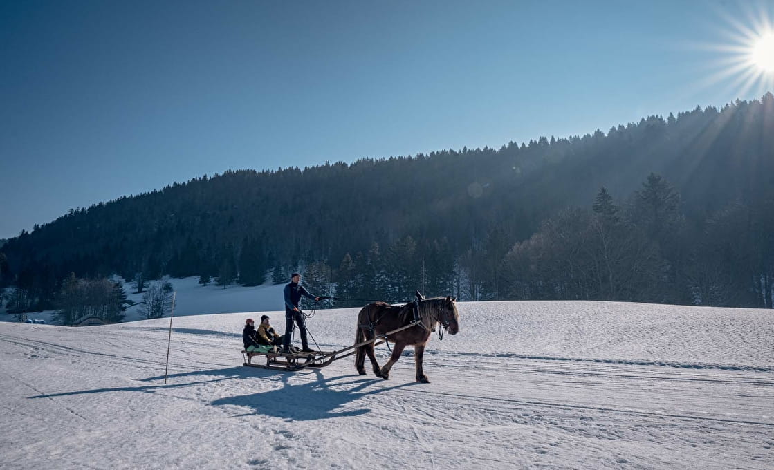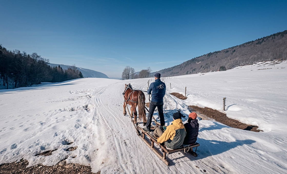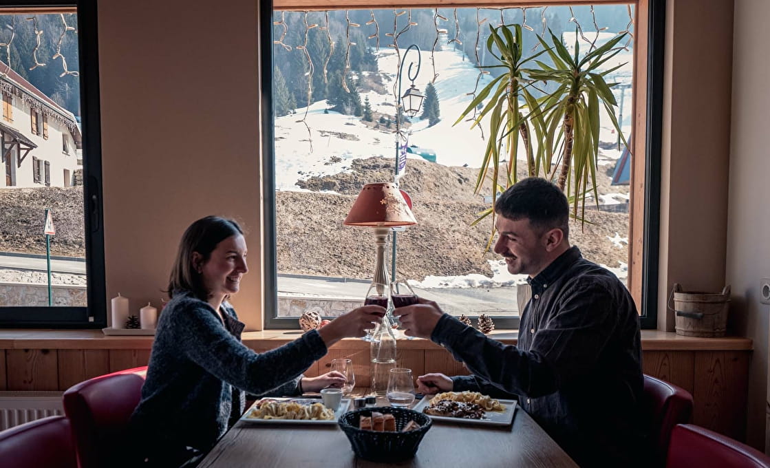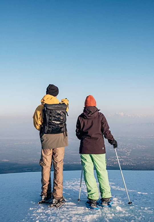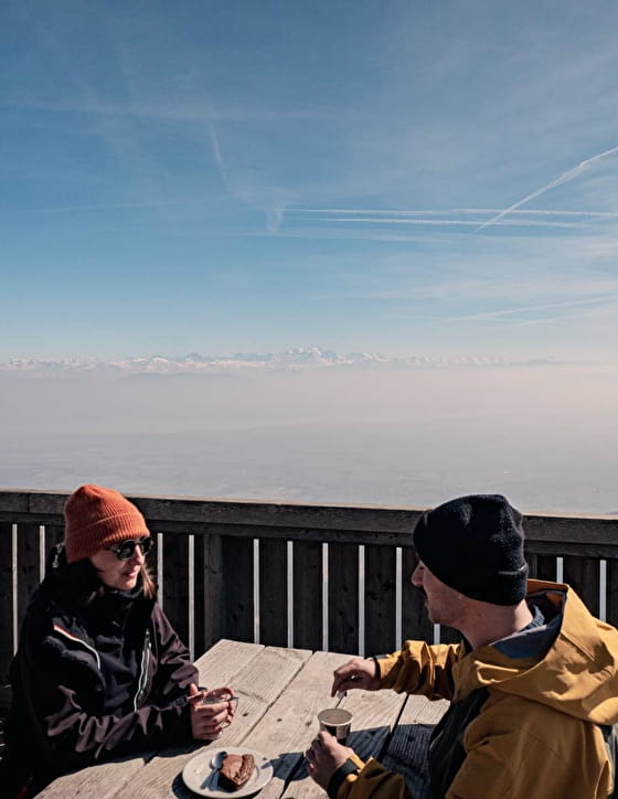 Im Winter kommen Wanderer, Skifahrer und Liebhaber aussergewöhnlicher Landschaften in diesem Bar-Restaurant zusammen, um ein 360°-Panorama auf den Mont Blanc, die Alpen und den Genfersee zu bewundern, dessen Umrisse am Fusse der Ebene des Pay de Gex zu erkennen sind.
