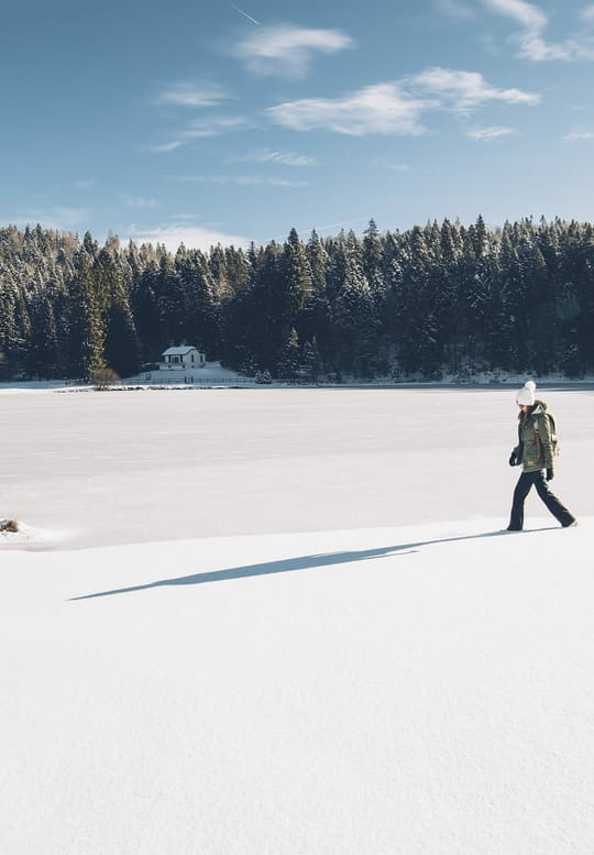 Selbst wenn es bitterkalt ist, lässt es sich an den Ufern eines Sees im Juragebirge Kraft tanken und auf die Natur zurückbesinnen. Diese spiegelähnlichen Wasserflächen mitten in der Natur bieten zwischen Dezember und März einen besonders schönen Anblick. Lac de Saint-Point, Lac des Rousses, Lac Genin … In einer allumfassenden Stille, wenn sich der Himmel in sein schönstes Blau hüllt und die Sonne langsam untergeht, stellt sich ein atemberaubendes Schauspiel ein. Zieh deine wärmsten Kleider an und begib dich zu Fuss, mit Schneeschuhen oder mit Langlaufski auf Entdeckungsreise!