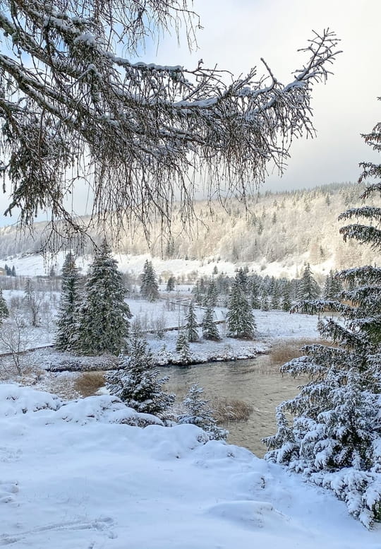 Ob mit Schneeschuhen oder Langlaufski: Der Parcours führt dich an einem spektakulären Panorama vorbei, in dem die Natur die Hauptrolle spielt. Nur vereinzelte, typische Bauernhöfe der Franche-Comté erinnern uns daran, dass hier Menschen leben.