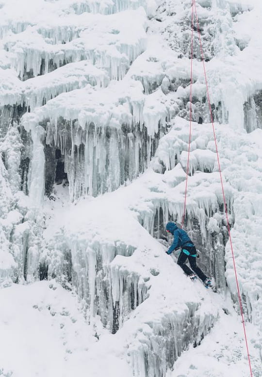 Mithilfe von Eispickeln und Steigeisen kletterst du unter Anleitung eines Bergführers die zugefrorenen Wasserfälle hoch.